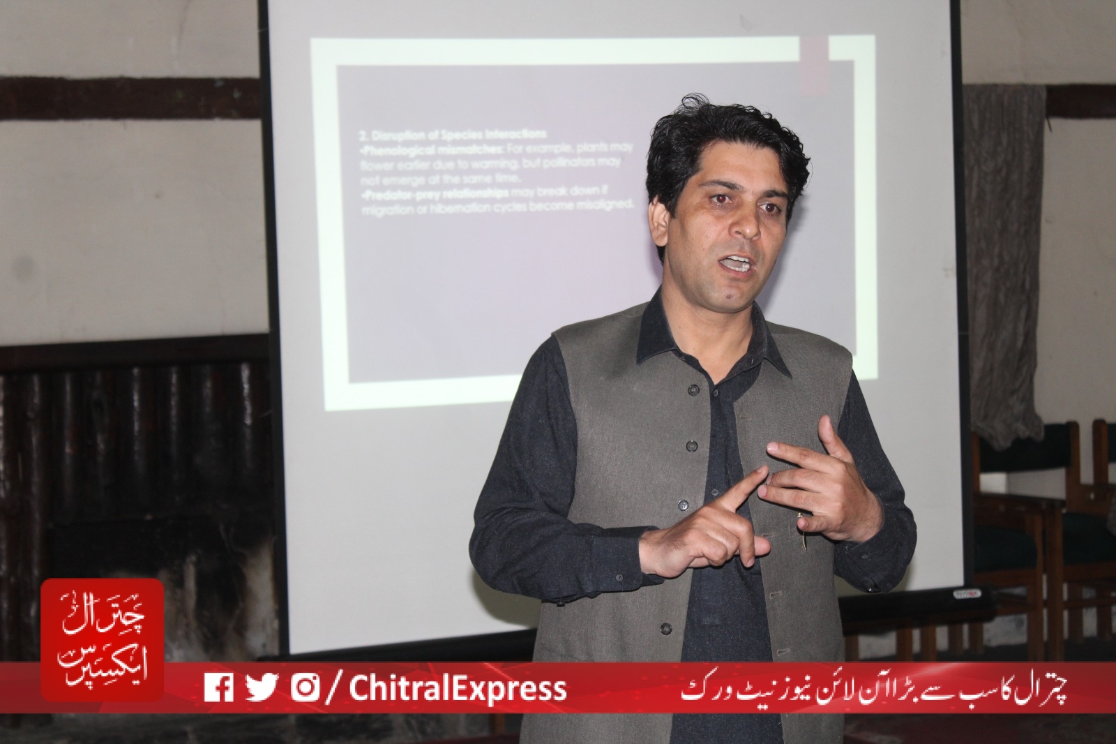چترال کے جنگلات اور جنگلی حیات پر موسمیاتی تبدیلی کے اثرات کا جامع جائزہ پیش کیا اور تحقیق پر مبنی حل کی ضرورت پر روشنی ڈالی۔ محکمہ جنگلات، این ٹی ایف پی، چترال گول نیشنل پارک اور محکمہ وائلڈ لائف سے آئے ہوئے منتظمین نے گروپ ورک کے