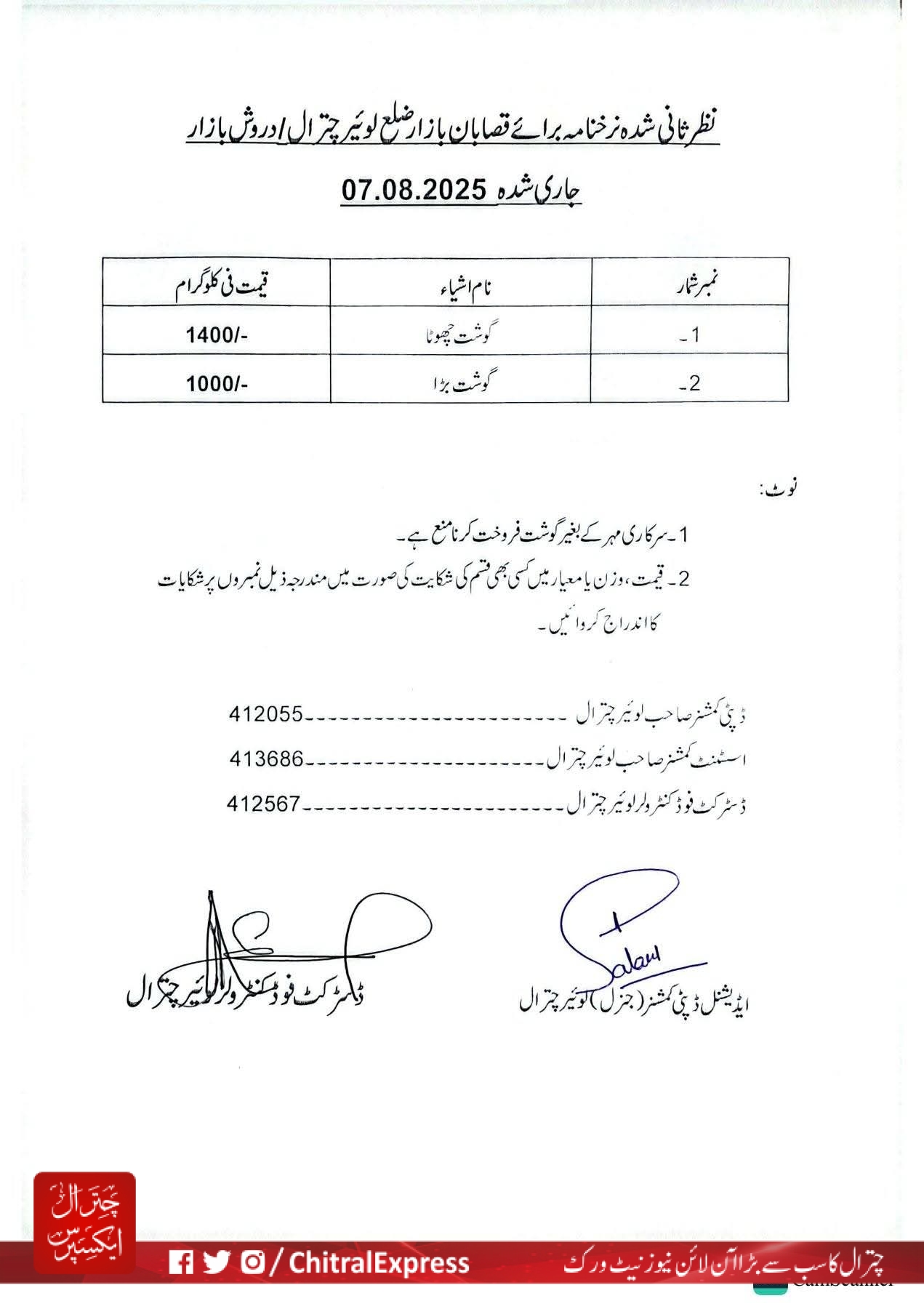 چترال (چترال ایکسپریس) ضلعی انتظامیہ اور پرائس ریویو کمیٹی کی جانب سے چھوٹے اور بڑے گوشت کی قیمتوں میں حالیہ اضافے پر صارفین نالاں ہیں۔