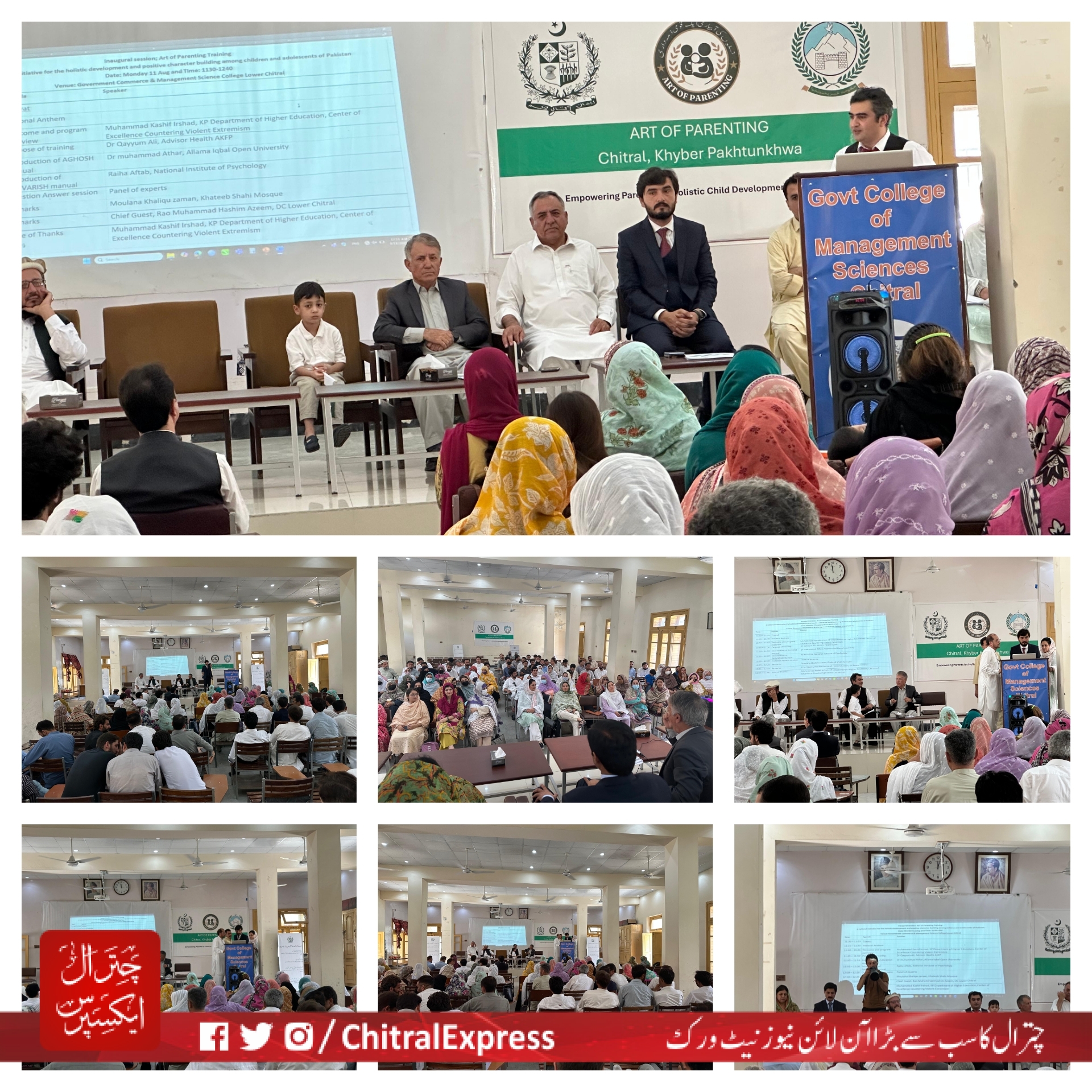 چترال (چترال ایکسپریس)سکولوں اور کالجوں کے اساتذہ اور محکمہ صحت کے اہلکاروں کے لئے’بچوں کی تربیت میں والدین کے کردار'(Art of parenting)پر پانچ روزہ تربیتی پروگرام چترال میں شروع ہوا جس میں ڈپٹی کمشنر لویر چترال محمد ہاشم عظیم مہمان خصوصی تھے۔ اس پروگرام کا انقعاد ہائر ایجوکیشن ڈیپارٹمنٹ خیبر پختونخوا، آغا خان فاونڈیشن، قائداعظم یونیورسٹی اور علامہ اقبال اوپن یونیورسٹی کے تحت ہورہا ہے جس میں آغوش پروگرام کے تحت پیدائش سے 9سال تک کے جبکہ9سے لے کر 18سال تک بچوں کے حوالے سے ‘پرورش پروگرام’کے تحت الگ الگ تربیت دی جارہی ہے۔
