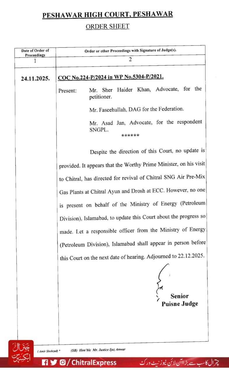 پشاور (چترال ایکسپریس)ایس این جی پی ایل کیس بمقام دروش آیون بروز سنگور چترال میں پشاور ہائیکورٹ نے توہین عدالت کیس جسے معروف سماجی و سیاسی شخصیت رضیت باللہ بزریعہ شیر حیدر ایڈووکیٹ دائر کیا ہوا ہے