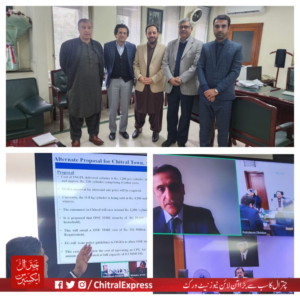 انہوں نے بتایا کہ آج وفاقی وزارتِ پٹرولیم و قدرتی وسائل میں ایک اعلیٰ سطحی اجلاس منعقد ہوا، جس کی صدارت وفاقی وزیر پٹرولیم و قدرتی وسائل علی پرویز ملک نے کی۔ اجلاس میں وفاقی وزیر امورِ کشمیر و صدر مسلم لیگ (ن) خیبر پختونخوا انجینئر امیر مقام نے بذریعہ زوم آن لائن شرکت کرتے ہوئے چترال کے تینوں گیس پلانٹس کے کیس کی بھرپور وکالت کی۔