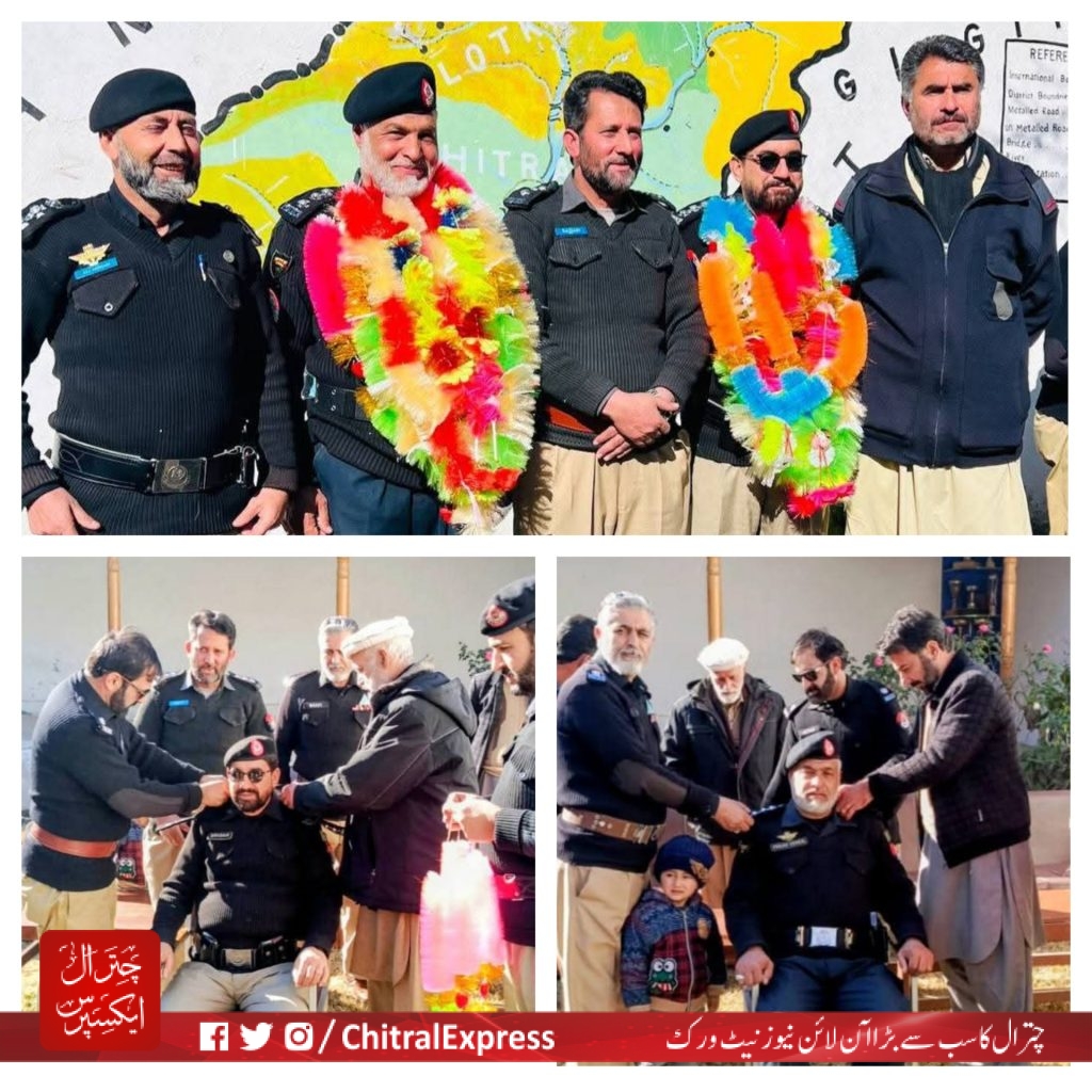 ایس۔پی۔ایلیٹ فورس عتیق الرحمن اور ریٹائرڈ ایس۔پی میر کلان خان نے سب انسپکٹر قربان پناہ اور ڈسٹرکٹ پبلک پراسکیوٹر ایاز زرین اور ایس۔پی انوسٹی گیشن محمد شفی شفاء نے سب انسپکٹر موسی محمد کو انسپکٹر رینک کے بیجز لگائے۔ تقریب میں ایس ڈی پی او سرکل چترال سجاد حسین اور لوئر چترال پولیس کے دیگر سینئر افسران بھی موجود تھے۔