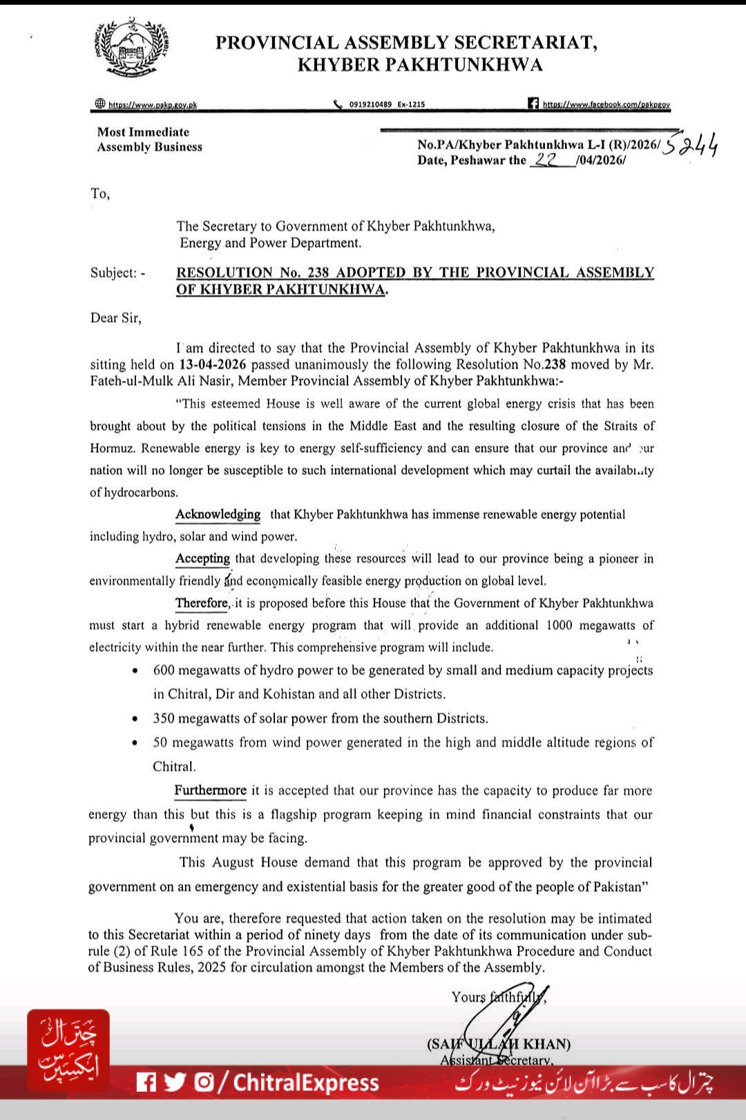 چترال (چترال ایکسپریس) رکن صوبائی اسمبلی فاتح الملک علی ناصر کی جانب سے پیش کی گئی اہم ترین قرارداد خیبر پختونخوا اسمبلی سیکرٹریٹ نے متفقہ طور پر منظور کرلی ہے۔ اسمبلی سیکرٹریٹ نے باقاعدہ مراسلہ محکمہ توانائی (Energy and Power Department) کو ارسال کر دیا ہے جس کے بعد اس منصوبے کو رواں سال کے سالانہ ترقیاتی پروگرام (ADP) میں شامل کیے جانے کا قوی امکان ہے۔